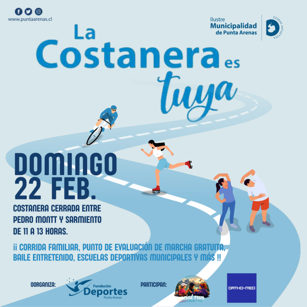 Este fin de semana, la ciudad de Punta Arenas será escenario de una amplia jornada deportiva y de actividad física, con la realización de una nueva versión de la actividad “La Costanera es Tuya”, iniciativa organizada por la Ilustre Municipalidad de Punta Arenas a través de su Fundación Municipal de Deportes, que busca impulsar la práctica de actividad física, y dar vida a uno de los principales espacios públicos de la comuna.